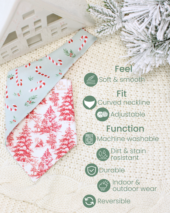 We offer 3 types of bandanas, all of which are wearable, easy to clean, comfy for your pup, and have an adjustable fit.