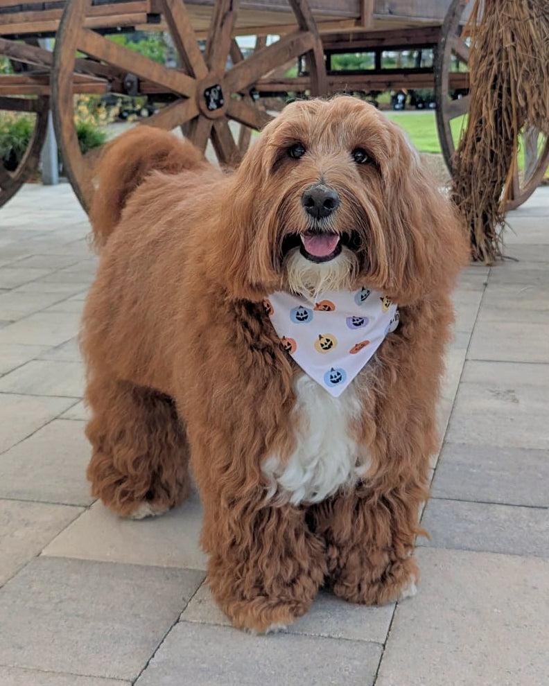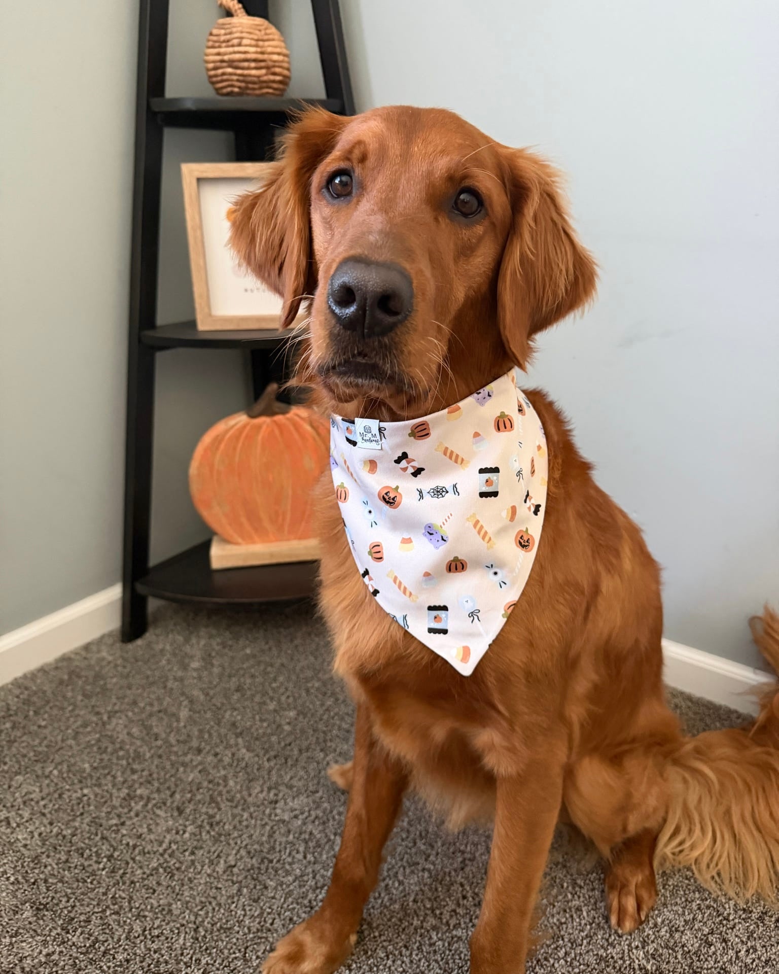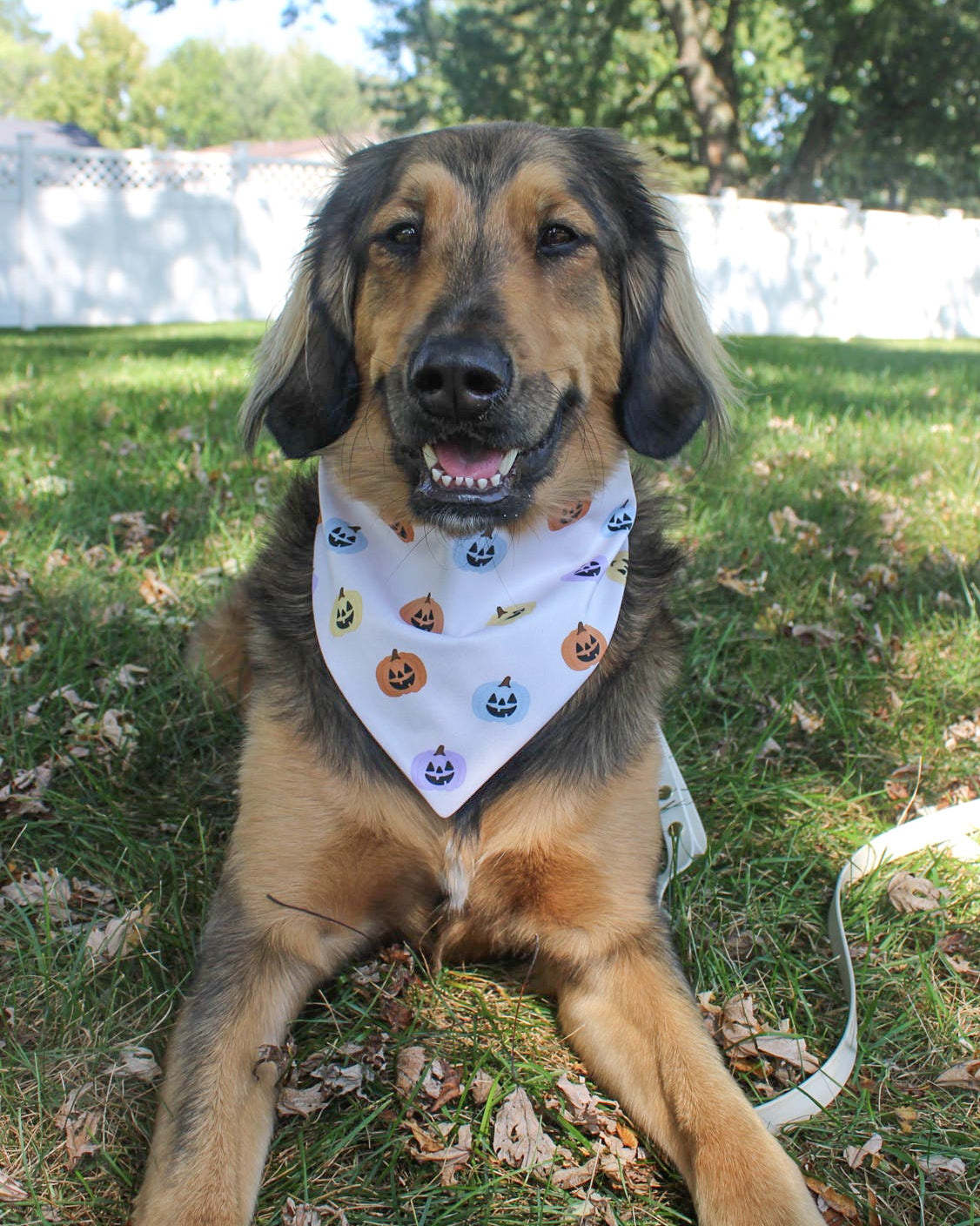 • Choose the next largest size if you are unsure or if your pet is floofy. A slightly oversized bandana is better than one too small, not to mention safer for your pup.