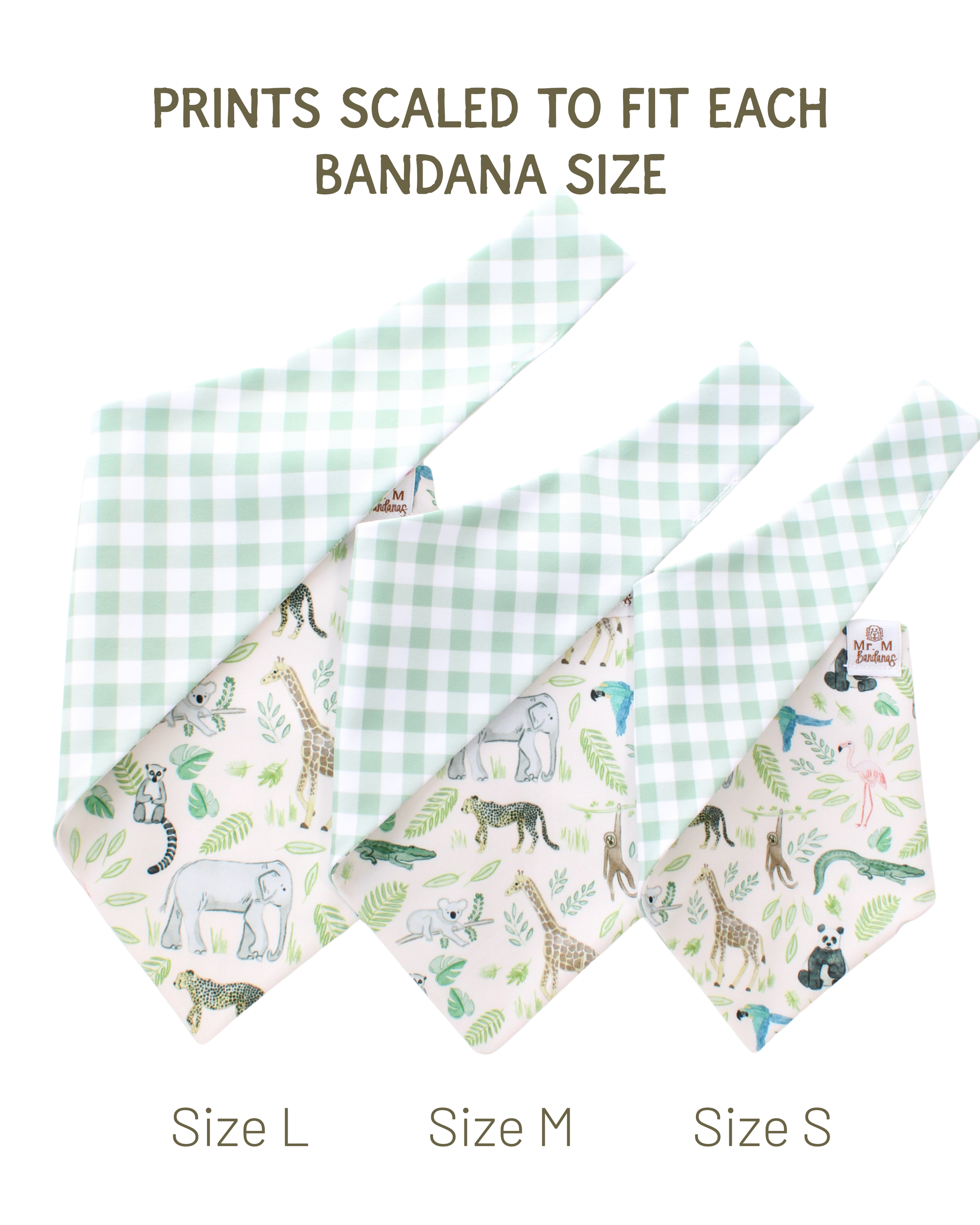 • Choose the next largest size if you are unsure or if your pet is floofy. A slightly oversized bandana is better than one too small, not to mention safer for your pup.
