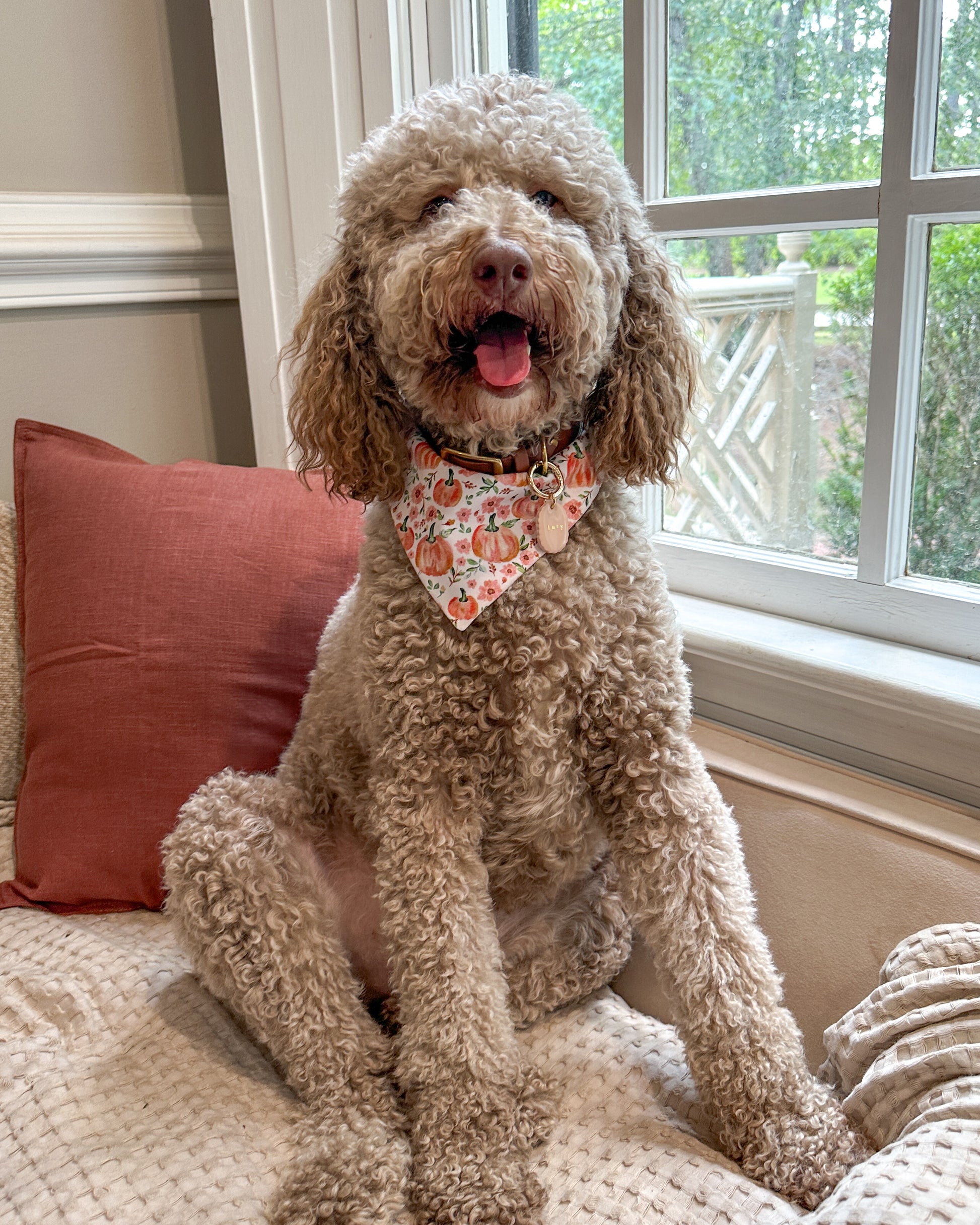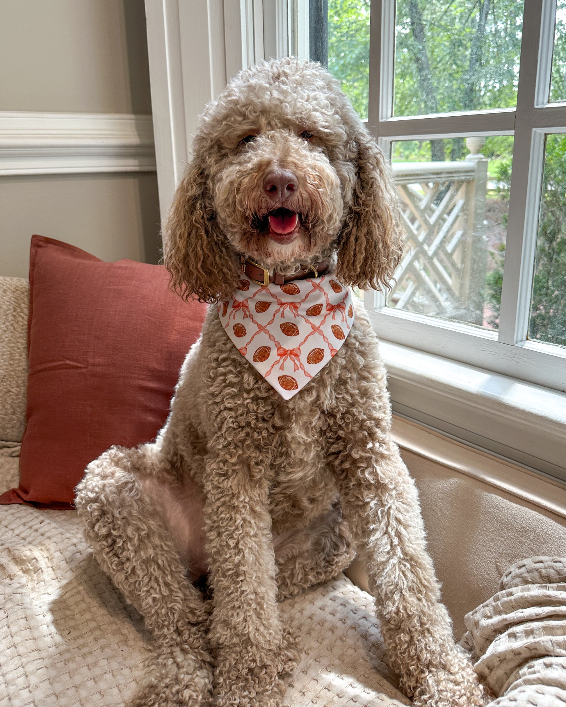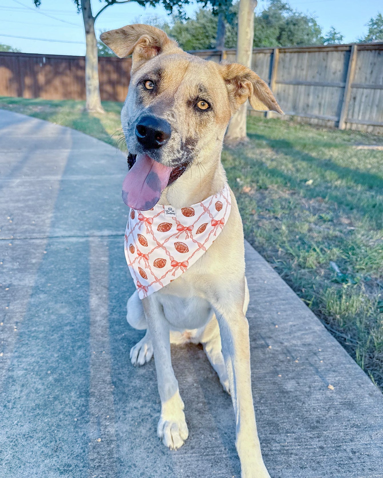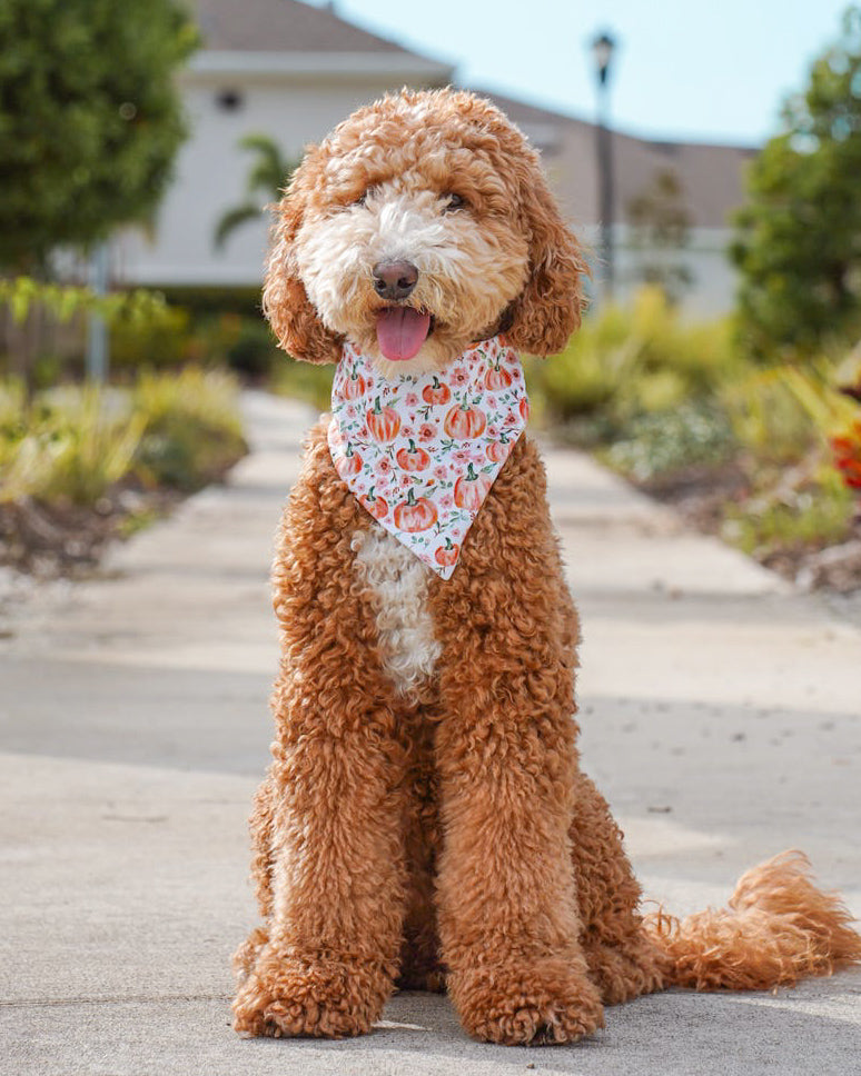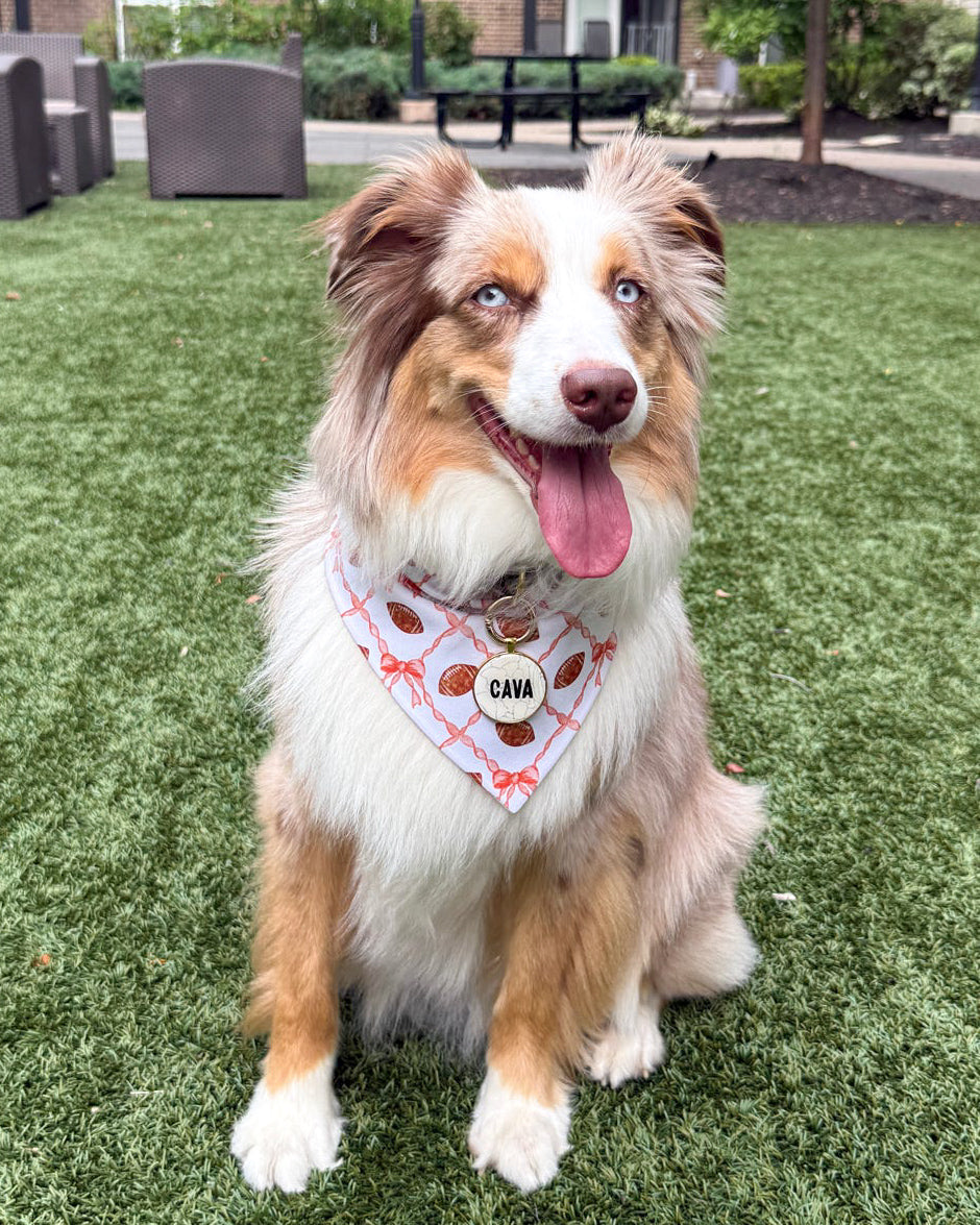 • Choose the next largest size if you are unsure or if your pet is floofy. A slightly oversized bandana is better than one too small, not to mention safer for your pup.