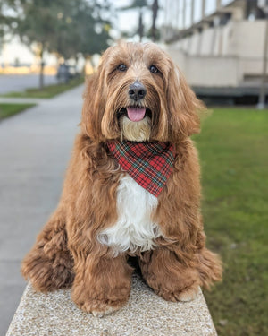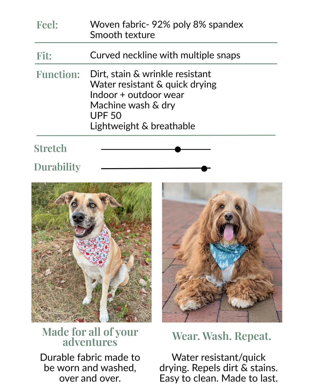 Our mission is to provide your pup with the highest quality, wearable and resilient bandanas. Designed for both indoor & outdoor wear, our bandanas are dirt & stain resistant and easy to clean, offering peace of mind and convenience. Our feel-good fabrics and tasteful designs ensure practicality and comfort without compromising on aesthetic.